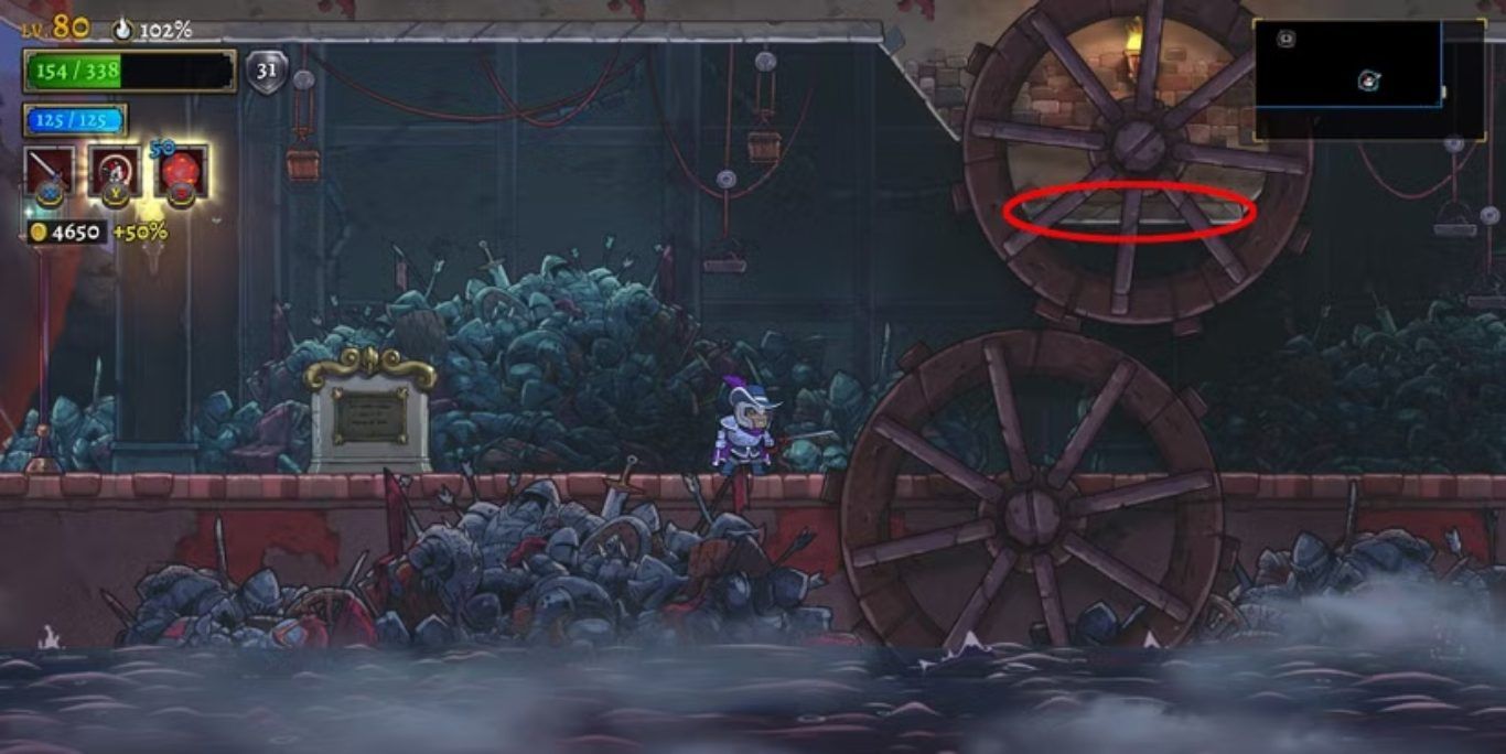 لحل Insight المسمى Missing Bodies في Rogue Legacy 2، يجب على اللاعب أولًا تحديد موقع Kerguelen Gatehouse داخل منطقة Axis Mundi، وهي البيئة الثانية في اللعبة. يمر اللاعبون أسفل هذا الهيكل مباشرة قبل الوصول إلى الغرفة التي تحتوي على باب الزعيم الخاص بالبيئة، ويجب عليهم الانتباه جيدًا إلى وجود لافتة مميزة وعجلتي ماء موضوعتين فوق بعضهما البعض بشكل عمودي، حيث يشير هذا الموقع إلى بداية المسار المطلوب لاستكمال المهمة. ولتوضيح الموقع بشكل دقيق، يمكن الاعتماد على الصورة المرفقة التي توضح الجزء المحدد من Axis Mundi المرتبط بهذه المهمة، إذ تساعد الصورة اللاعبين على فهم المكان الذي يجب استهدافه بالضبط وتفادي أي ارتباك أثناء البحث عن المسار المخفي.