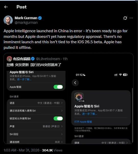 إطلاق بالخطأ قبل الموافقات التنظيميةبحسب تقرير نشرته وكالة Bloomberg نقلًا عن الصحفي Mark Gurman، فإن Apple قامت عن طريق الخطأ بإتاحة ميزات Apple Intelligence داخل الصين قبل الحصول على الموافقات التنظيمية اللازمة.