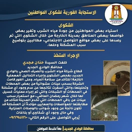 الأربعاء، 01 أبريل 2026 12:46 مكلفت حنان مجدي، محافظ الوادي الجديد، قطاع شركة مياه الشرب والصرف الصحي بالوادي الجديد، بإجراء التحاليل المعملية اللازمة؛ للتأكد من سلامة المياه، جاء ذلك بعد شكوى بعض المواطنين من جودة مياه الشرب وتغير بعض خواصها ببعض المناطق بمدينة الخارجة من خلال الشكوى التي تم رصدها على بعض مواقع التواصل الاجتماعي، مطالبين بتوضيح سبب المشكلة وحلها.