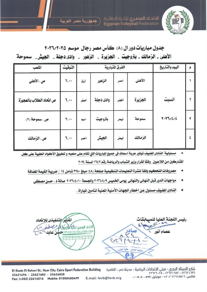 الأربعاء، 01 أبريل 2026 07:40 ماعتمدت لجنة المسابقات بإتحاد الكرة الطائرة جدول مباريات ربع نهائي كأس مصر للرجال للموسم المحلي 2025-2026 .