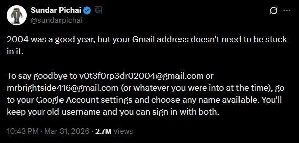 علق Sundar Pichai، الرئيس التنفيذي لشركة جوجل، على هذه الخطوة عبر منصة X، مؤكدًا أن المستخدمين لم يعودوا مضطرين للاحتفاظ بعناوين بريد قديمة لا تعكس هويتهم الحالية، وقال في منشوره:“كان عام 2004 عامًا جيدًا، لكن عنوان Gmail الخاص بك ليس مضطرًا لأن يظل عالقًا فيه"، كما أضاف: “إذا كنت ترغب في توديع عناوين مثل [email protected] أو [email protected]، يمكنك الآن التوجه إلى إعدادات حساب Google واختيار اسم جديد متاح.”