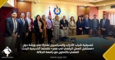 الأربعاء، 01 أبريل 2026 08:38 مشاركت تنسيقية شباب الأحزاب والسياسيين، بوفد من أعضائها في ورشة عمل نظمتها أكاديمية البحث العلمي والتكنولوجيا بالتعاون مع جامعة الجلالة، تحت عنوان «دوافع وآثار أشكال العمل الجديدة والعمل عبر المنصات في مصر»، وذلك بمشاركة ممثلين عن جهات حكومية وبرلمانية، إلى جانب خبراء سوق العمل ومنصات التوظيف والعمل الحر.