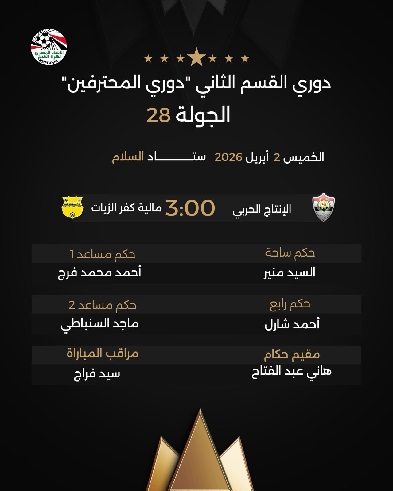 في الوقت نفسه يدير السيد منير لقاء الإنتاج الحربى ومالية كفر الزيات المقرر إقامته بإستاد السلام والذى يسعى فيه الفريقان لتحقيق نتيجة إيجابية خاصة وأنهم بعيد عن الهبوط وأيضا بعيدين عن المنافسة على الصعود .
