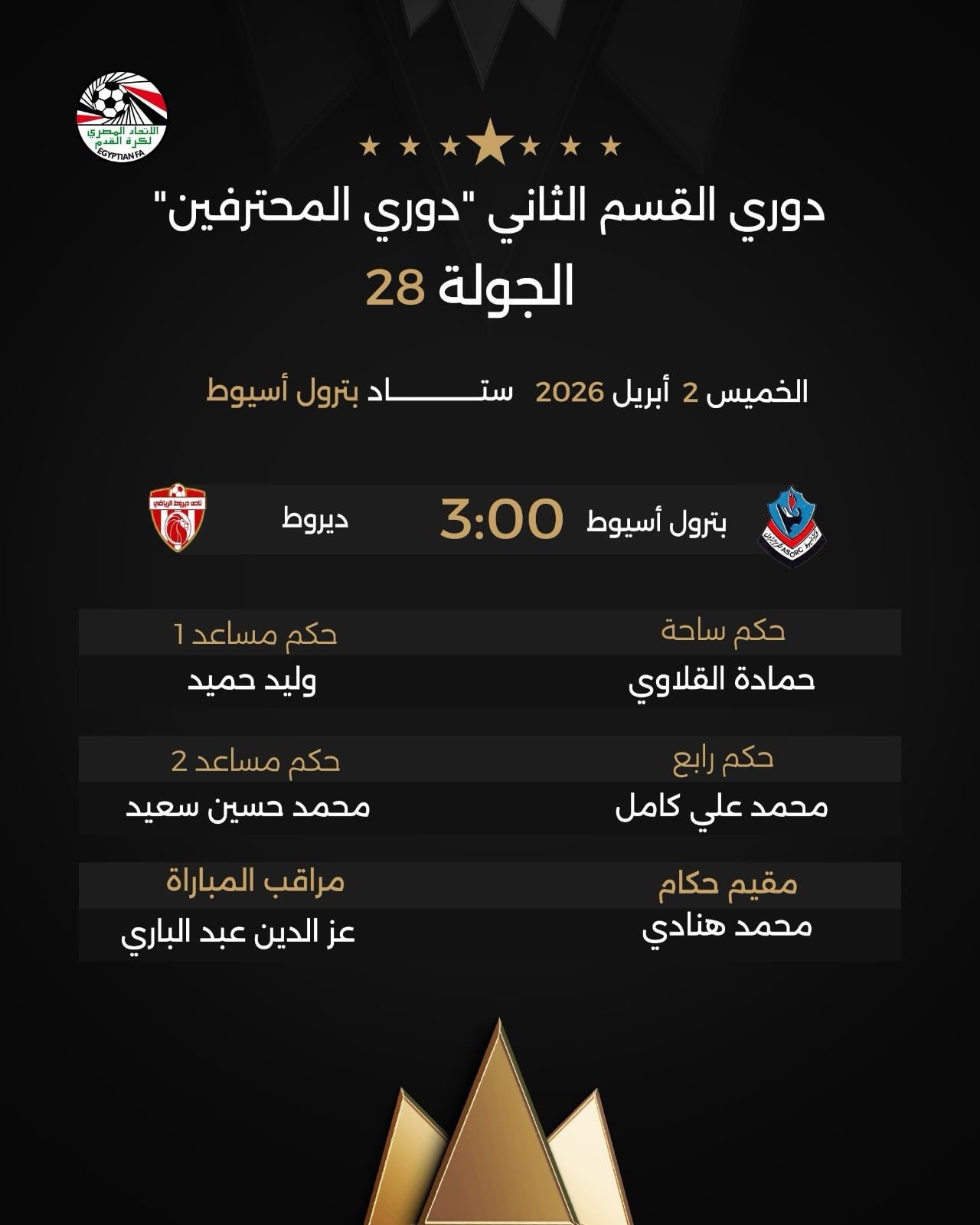 ويقود حمادة القلاوى مباراة بترول أسيوط وديروط والتي يسعى فيها أصحاب الأرض لإستغلال عامل الأرض من أجل تحقيق الفوز للإقتراب أكثر من تحقيق الحلم بالصعود لدورى الأضواء .