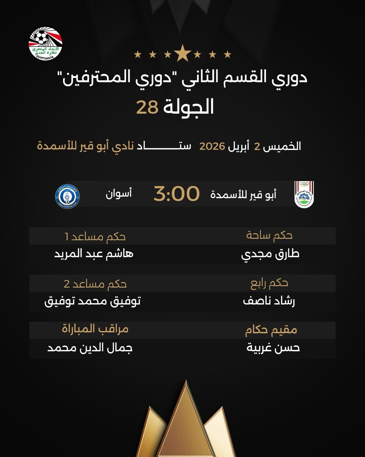 أبو قير – أسوانيدير طارق مجدى مباراة أبو قير للأسمدة وأسوان المقرر إقامتها بالإسكندرية بعد المطالبات العديدة التي أقامها مسئولو أبو قير للأسمدة ، ويسعى أمير عزمى مجاهد لمواصلة الإنتصارات بعد الفوز الذى حققه الفريق فى مباراته الماضية خارج ملعبه على مالية كفر الزيات بهدف مقابل للاشئ .
