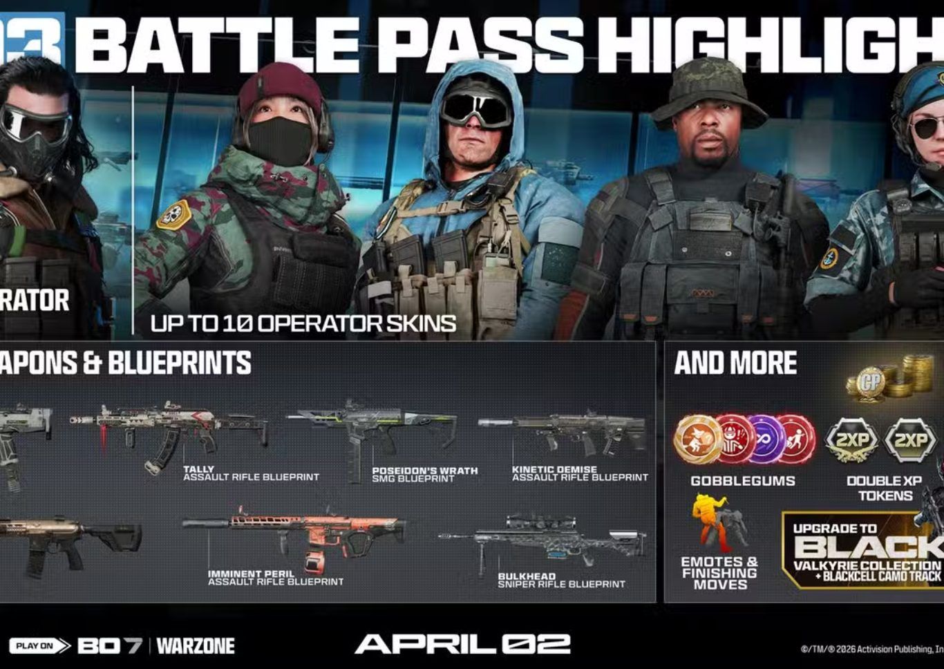 أعلنت استوديوهات Treyarch Studios، مطورة لعبة Call of Duty: Black Ops 7، رسميًا عن Battle Pass الجديد للموسم الثالث، الذي من المقرر إطلاقه يوم الخميس، 2 أبريل 2026، ضمن تحديث المحتوى الموسمي الأسبوعي. سيتيح هذا التحديث للاعبين في كل من Call of Duty: Black Ops 7 و Warzone فرصة الحصول على Battle Pass للموسم الثالث، سواء النسخة المجانية أو النسخة المميزة، مع توفير مكافآت إضافية لمن يرغب في استغلال كامل محتوى الموسم الجديد. إلى جانب ذلك، أعادت Call of Duty تقديم نسخة BlackCell من Battle Pass، التي تمنح اللاعبين مزيدًا من المكافآت الحصرية والمحتوى الإضافي.