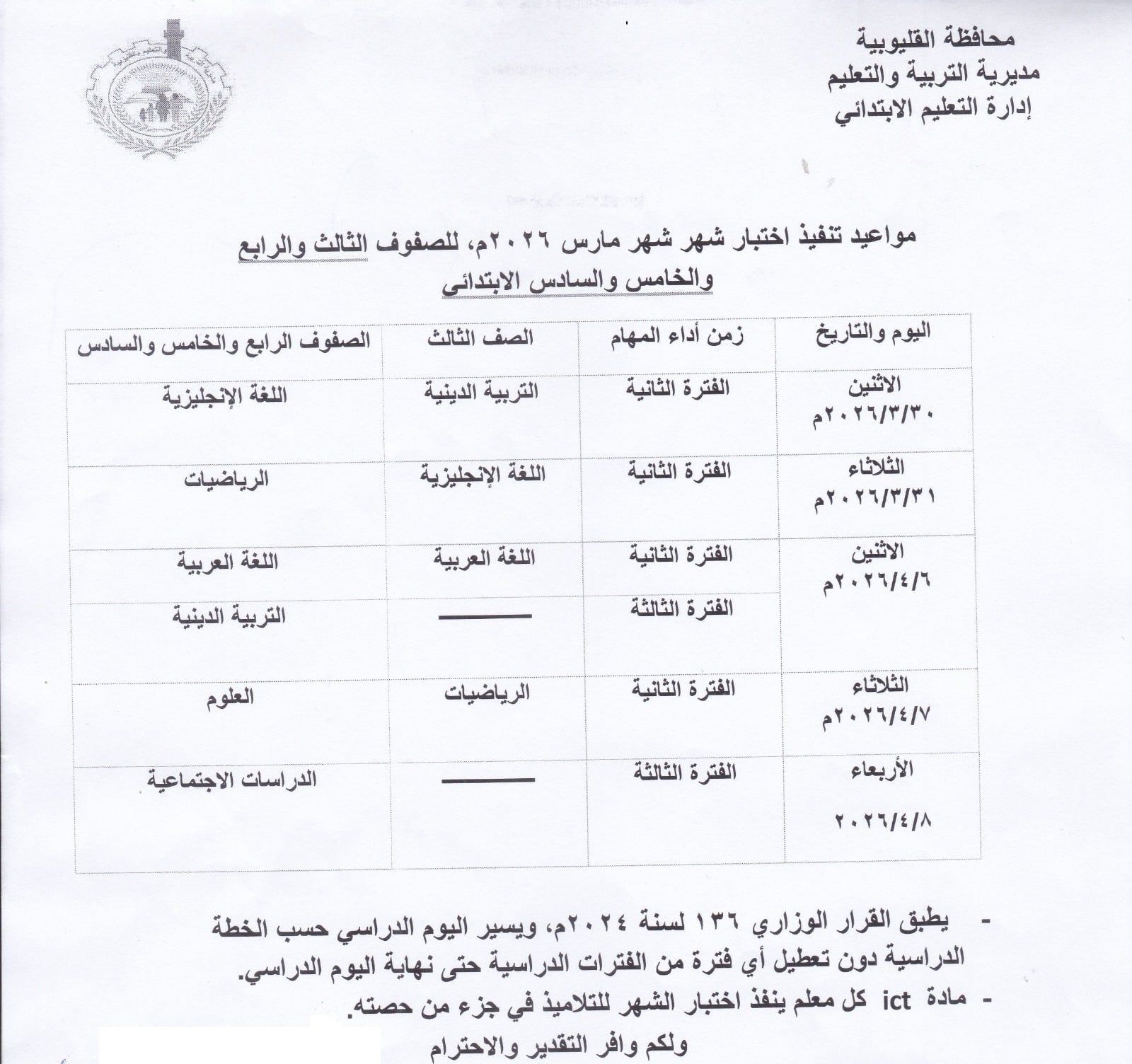 جدول اختبارات شهر مارس للصفوف الرابع والخامس والسادس الابتدائي بالقليوبية بعد التعديل:- الإثنين 30 / 3 / 2026: اختبار مادة اللغة الإنجليزية