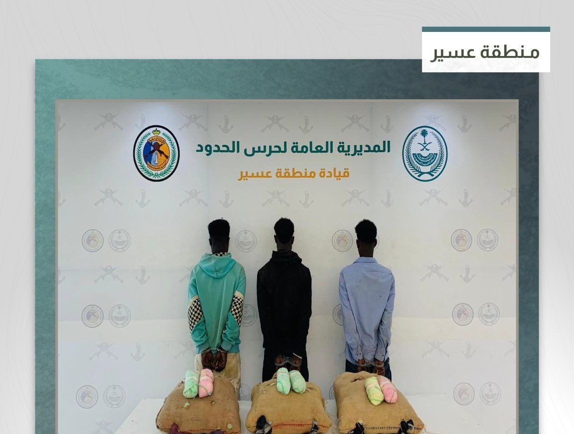 ألقت الدوريات البرية لحرس الحدود في قطاع الربوعة بمنطقة عسير القبض على (3) مخالفين لنظام أمن الحدود من الجنسية الإثيوبية، لتهريبهم (75) كيلوجراما من نبات القات المخدر.