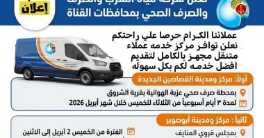 وحددت الشركة جدول عمل المراكز المتنقلة خلال شهر أبريل 2026، حيث سيعمل مركز ومدينة القصاصين الجديدة بمحطة صرف صحي عزبة الهوانية بقرية الشروق لمدة ثلاثة أيام أسبوعياً من الثلاثاء إلى الخميس طوال الشهر ، ويبدأ مركز ومدينة أبوصوير بمجلس قروي المنايف من الخميس 2 أبريل وحتى الاثنين 6 أبريل 2026، ويستمر بعد ذلك كل يومي الثلاثاء والخميس.