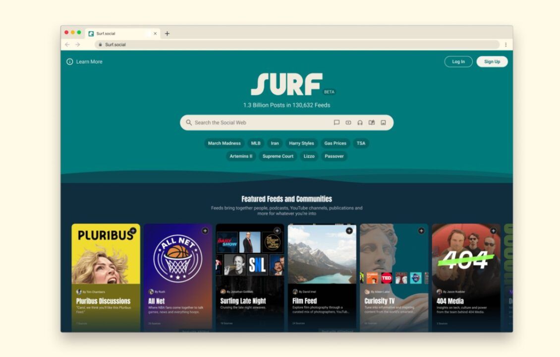 وتقدّم Surf تجربة يصعب تصنيفها ضمن فئة واحدة، إذ تجمع بين كونها تطبيقًا للشبكات الاجتماعية اللامركزية مثل Mastodon و Bluesky، وأداة لاستخلاص المحتوى عبر الاشتراك في المواقع والبودكاست وقنوات يوتيوب، بالإضافة إلى إمكانية استخدامها كأداة لإنشاء موجزات محتوى مخصّصة أو متابعتها على غرار المجلات الرقمية.