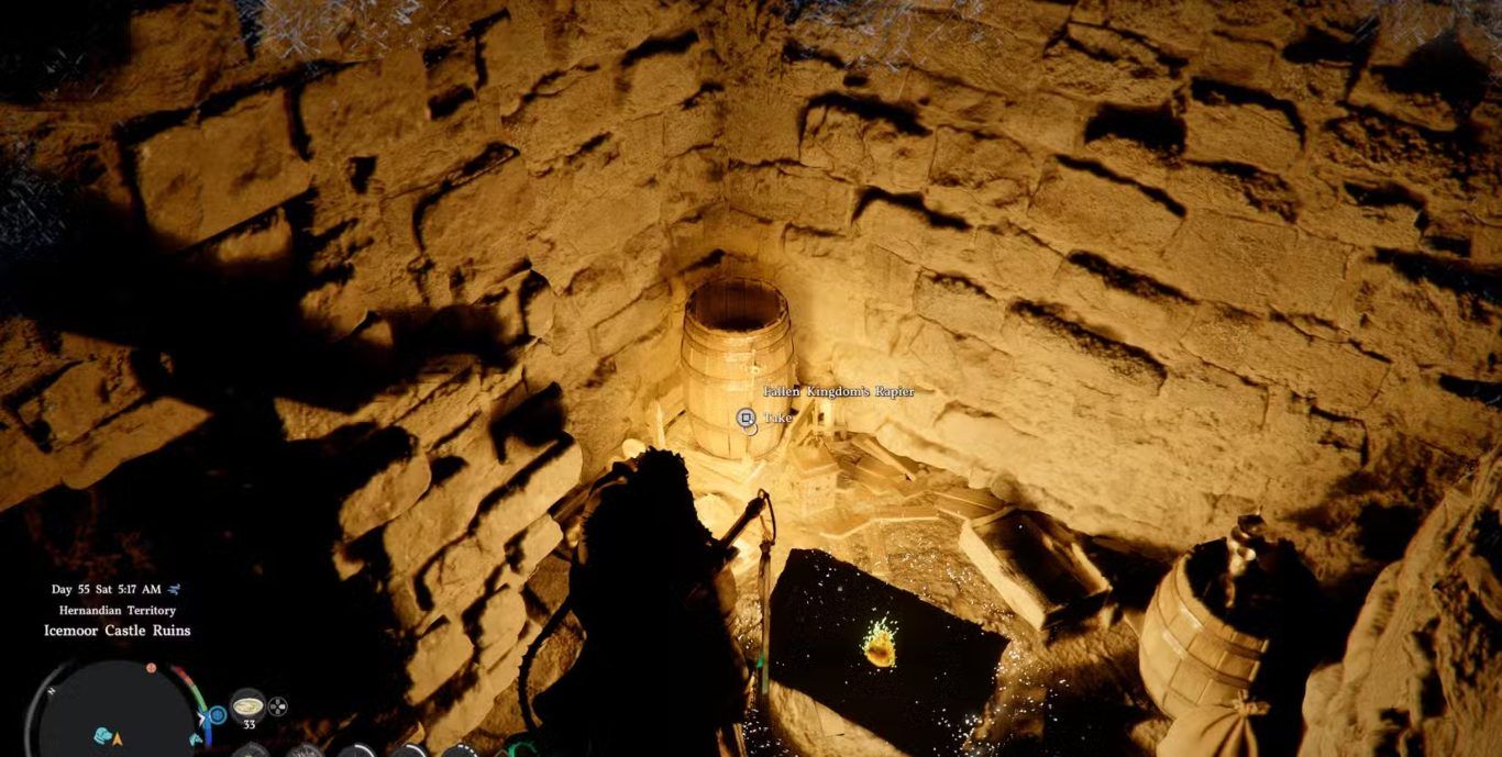 للوصول إلى هذا الكنز ينبغي أن تتجه أولا إلى منتصف Icemoor Castle Ruins وهو المكان نفسه الذي خضت فيه مواجهة The Stag Lord. وبعد الوصول إلى هذه النقطة عليك أن تنظر نحو الجهة الشمالية خلف عرش The Stag Lord حيث يوجد طريق يقود إلى الأعلى عبر الدرج. وبعد صعودك هذا المسار ينبغي أن تنعطف إلى اليمين وتعبر الجسر الموجود هناك لتبدأ مرحلة جديدة من البحث داخل الأطلال.
