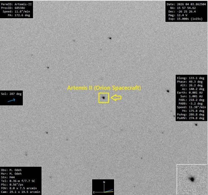 قال المهندس محمد شوكت عودة مدير مركز الفلك الدولي، في إطار متابعة مهمة «أرتيمس» المتجهة نحو القمر التي انطلقت مساء يوم الأربعاء 01 إبريل/ نيسان الجاري، تمكن مرصد الختم الفلكي في أبوظبي التابع لمركز الفلك الدولي مساء يوم الجمعة 03 إبريل (الليلة الماضية)، من تصوير المركبة الفضائية «أوريون» أثناء توجهها نحو القمر، وهي تحوي بداخلها أربعة رواد فضاء، والهدف من الرحلة هو الدوران حول القمر والعودة إلى الأرض وإجراء بعض التجارب العلمية خلال هذه الرحلة، وذلك تمهيداً لإطلاق رواد فضاء للهبوط على سطح القمر عام 2028م.