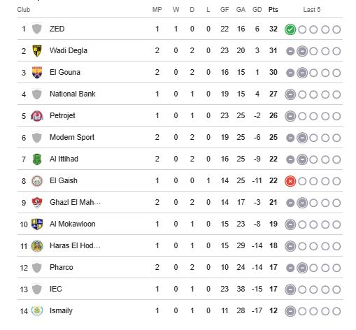 ويتصدر فريق زد ترتيب مجموعة الهبوط في الدوري المصري ثم يحل وادي دجلة في المركز الثاني والجونة في المركز الثالث، ويأتي من بعدهم البنك الأهلي في المركز الرابع.