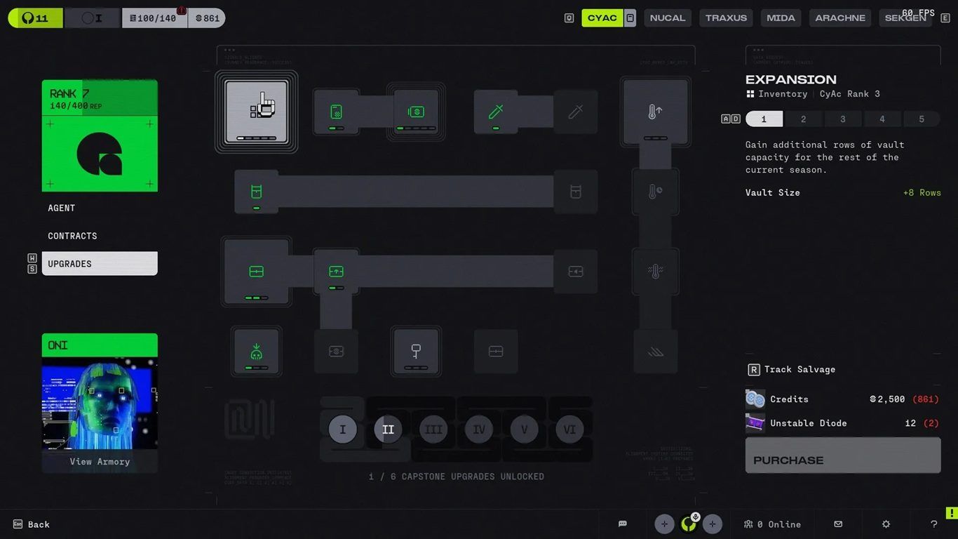 خزنتك هي مخزونك الرئيسي حيث تخزن جميع أغراضك. بشكل افتراضي، يمكنك الاحتفاظ بـ 160 عنصرًا فيها. لتجاوز هذا الحد، ستحتاج إلى ترقية التوسعة التي يقدمها فصيل سايبر أكمي. الحصول على هذه الترقية ليس صعبًا طالما لديك رصيد كافٍ من العملات.