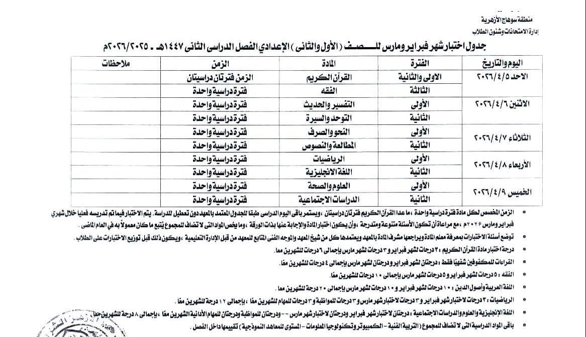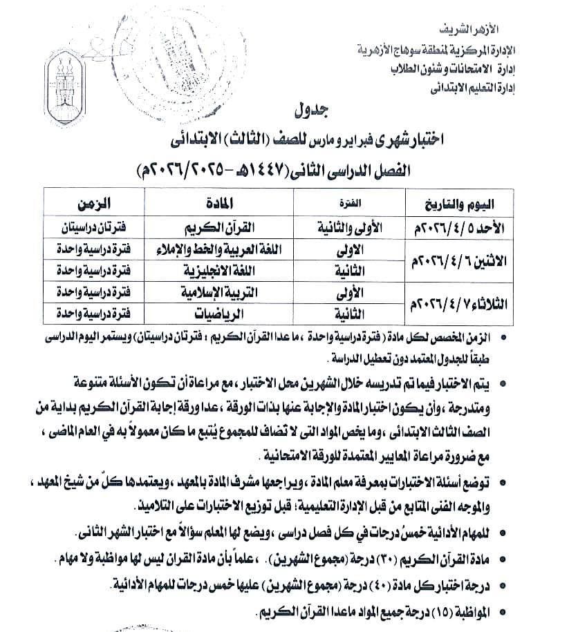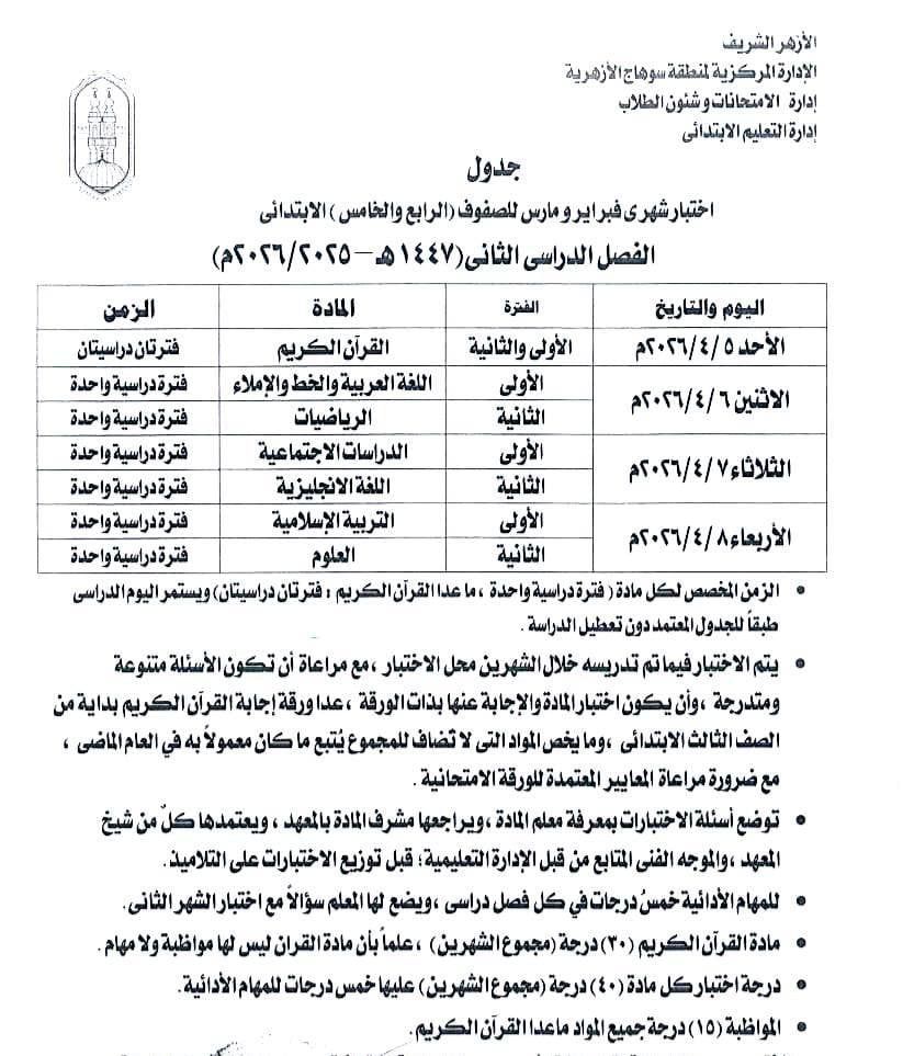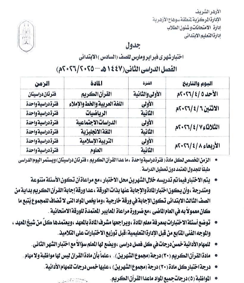 الأحد، 05 أبريل 2026 04:00 صأعلنت الإدارة المركزية لمنطقة سوهاج الأزهرية، برئاسة قطاع المعاهد الأزهرية، اعتماد جدول اختبارات شهرى فبراير ومارس لطلاب الثالث والرابع والخامس السادس الابتدائي والأول والثانى الإعدادى صفوف النقل للعام الدراسي 2025 / 2026، وذلك في إطار الاستعدادات الجارية لانطلاق امتحانات الفصل الدراسي الثاني.