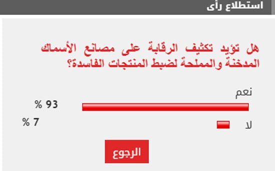 وأيد 93% من القراء مطالب تكثيف الرقابة على مصانع الأسماك المدخنة والمملحة لضبط المنتجات الفاسدة، بينما عارض 7% من القراء مطالب تكثيف الرقابة على مصانع الأسماك المدخنة والمملحة لضبط المنتجات الفاسدة.