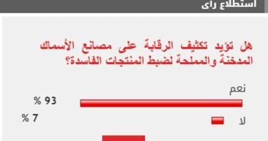 فى استطلاع للرأى طرحه "اليوم السابع" تحت عنوان تكثيف الرقابة على مصانع الأسماك المدخنة والمملحة لضبط المنتجات الفاسدة؟، أيد غالبية القراء مطالب تكثيف الرقابة على مصانع الأسماك المدخنة والمملحة لضبط المنتجات الفاسدة.