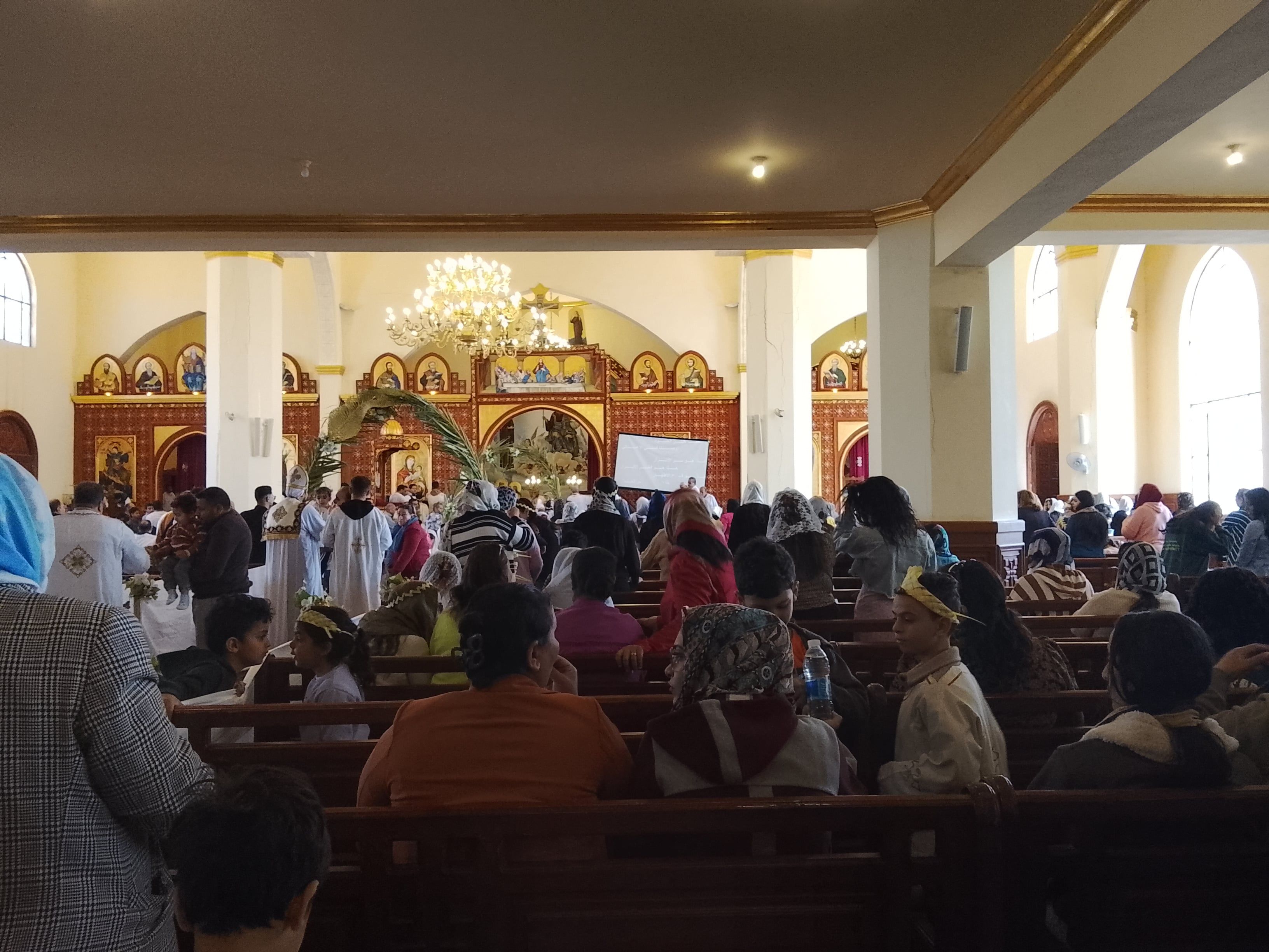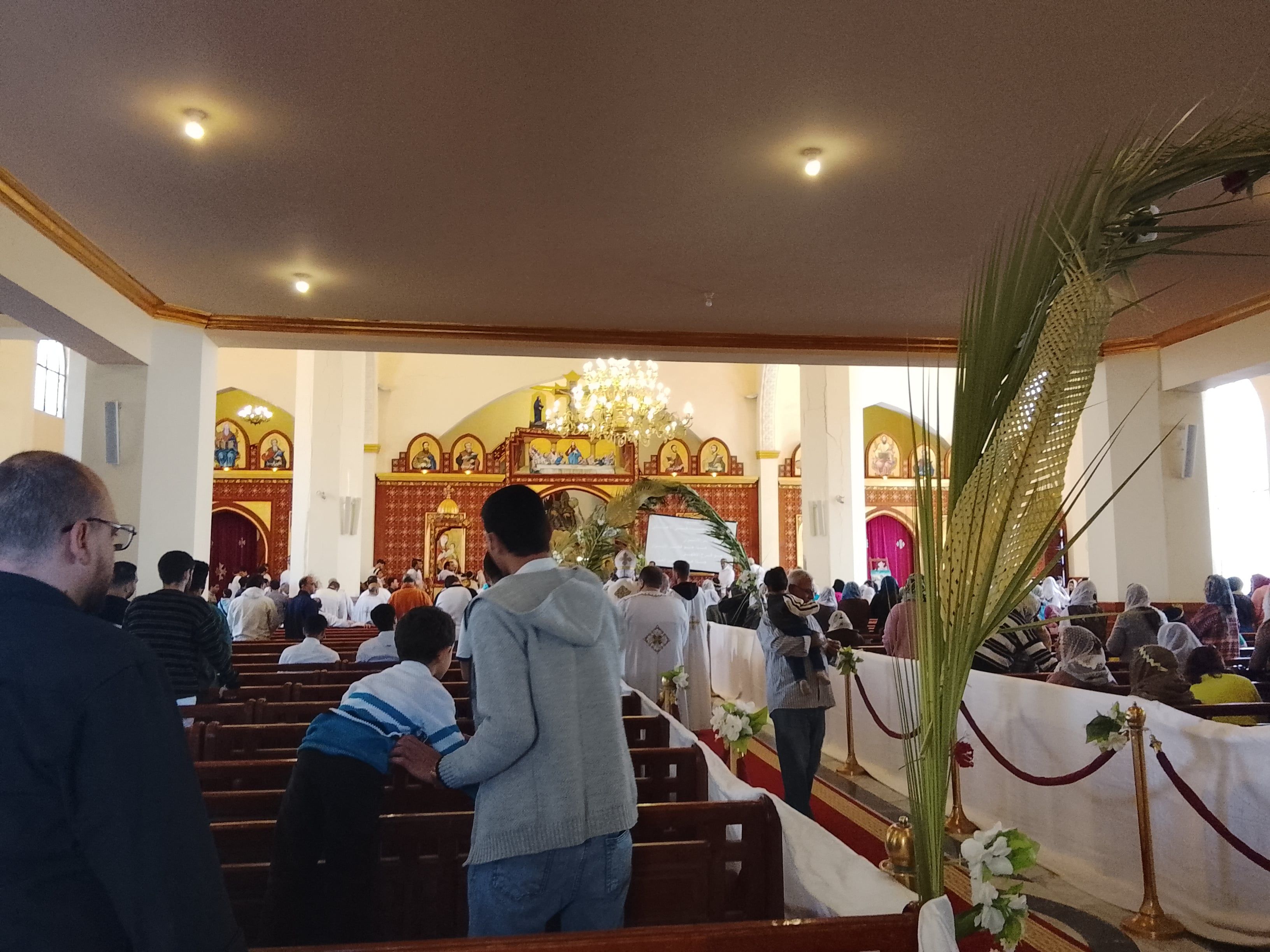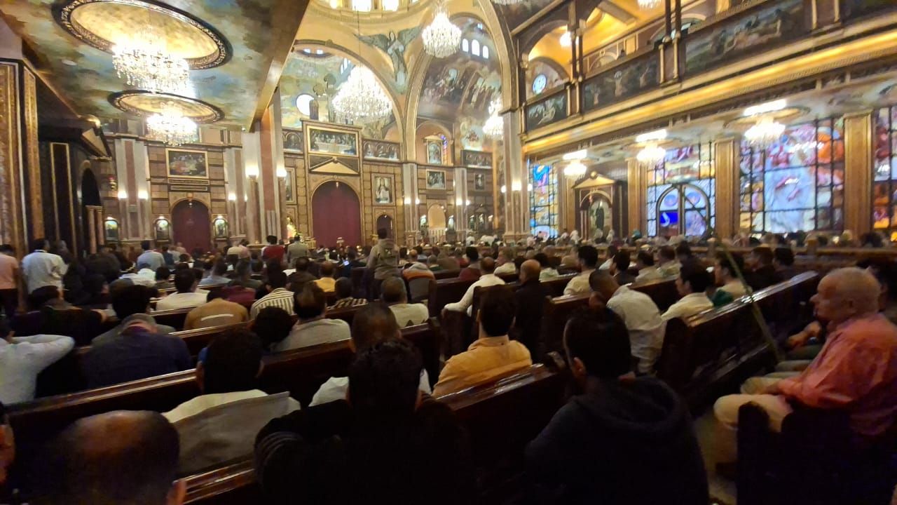 زحام داخل الكنيسة لأداء صلاة القداسوخلال القداس، امتلأت الكاتدرائية بالمصلين، وارتفعت الترانيم والألحان الكنسية، فيما حمل المشاركون السعف المشغول في أشكال رمزية مثل الصليب والتيجان، تعبيرًا عن الفرح والاحتفال بهذه المناسبة الدينية..