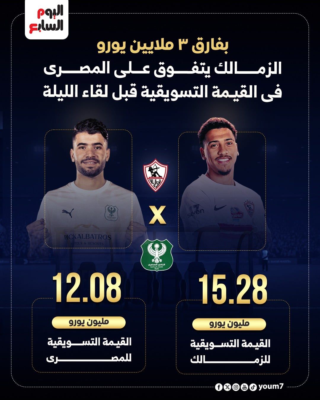 الزمالك يتفوق على المصري فى القيمة التسويقيةيتفوق نادي الزمالك على المصري البورسعيدي في القيمة التسويقية بفارق 3 ملايين يورو، حسب موقع ترانسفير ماركت، حيث بلغت القيمة التسويقية للفارس الأبيض 15.28، فيما جاءت القيمة التسويقية للنسر البورسعيدي 12.08 مليون يورو.