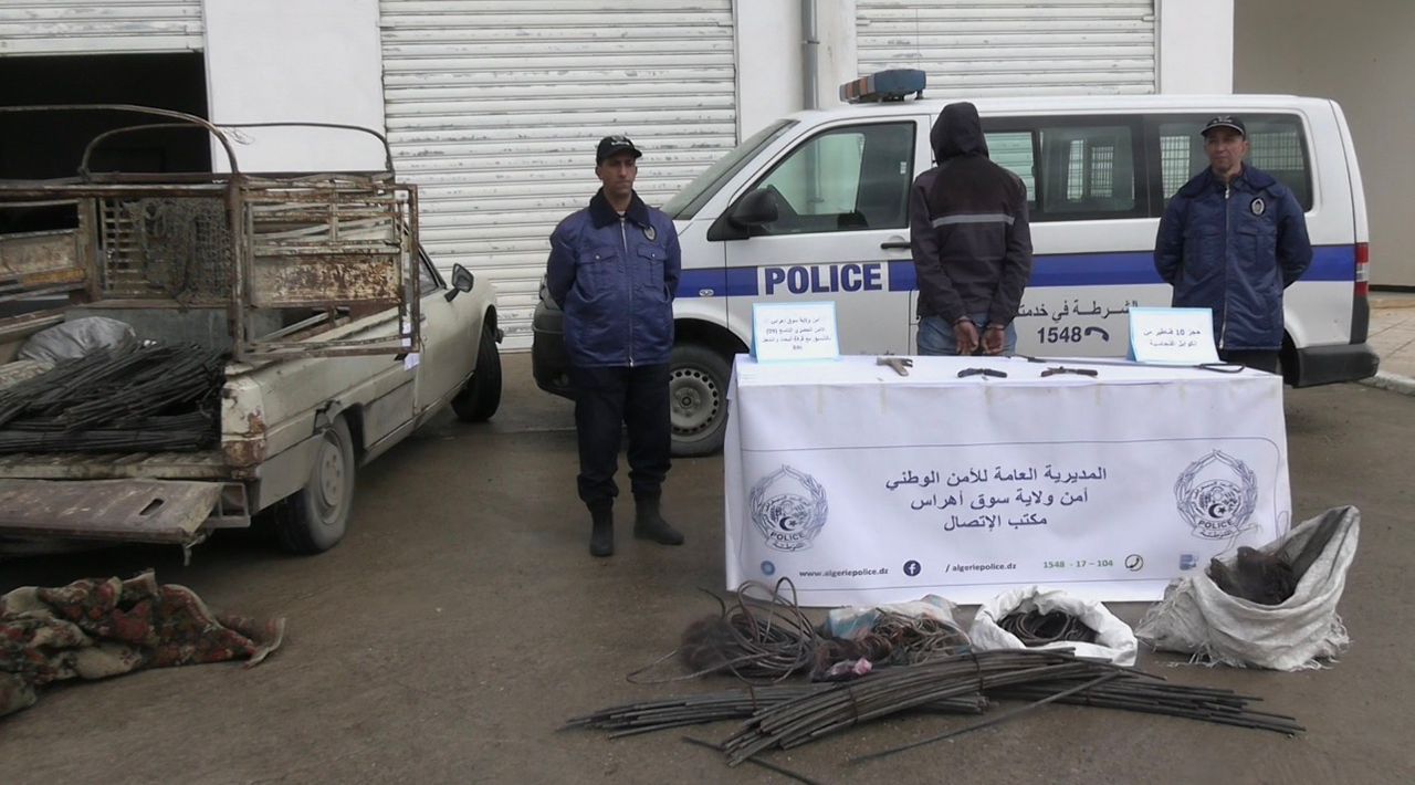 تمكنت قوات الشرطة القضائية بالأمن الحضري التاسع بأمن سوق أهراس بالتنسيق مع فرقة البحث والتدخل من حجز 10 قناطير من كوابل النحاس. خاصة بشركة اتصالات الجزائر والشركة الوطنية للنقل بالسكك الحديدية مع توقيف مشتبه فيه.