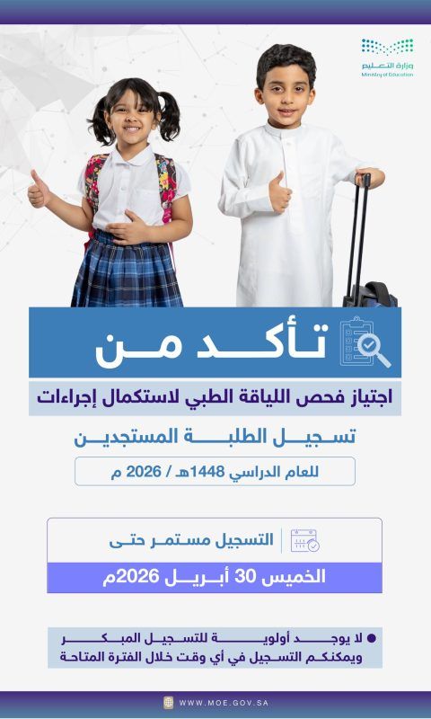 أعلنت وزارة التعليم عن بدء استقبال طلبات تسجيل الطلاب والطالبات المستجدين في الصف الأول الابتدائي ومرحلة رياض الأطفال للعام الدراسي القادم 1448هـ، وذلك عبر بوابتها الإلكترونية اعتبارًا من اليوم وحتى 30 أبريل الجاري.