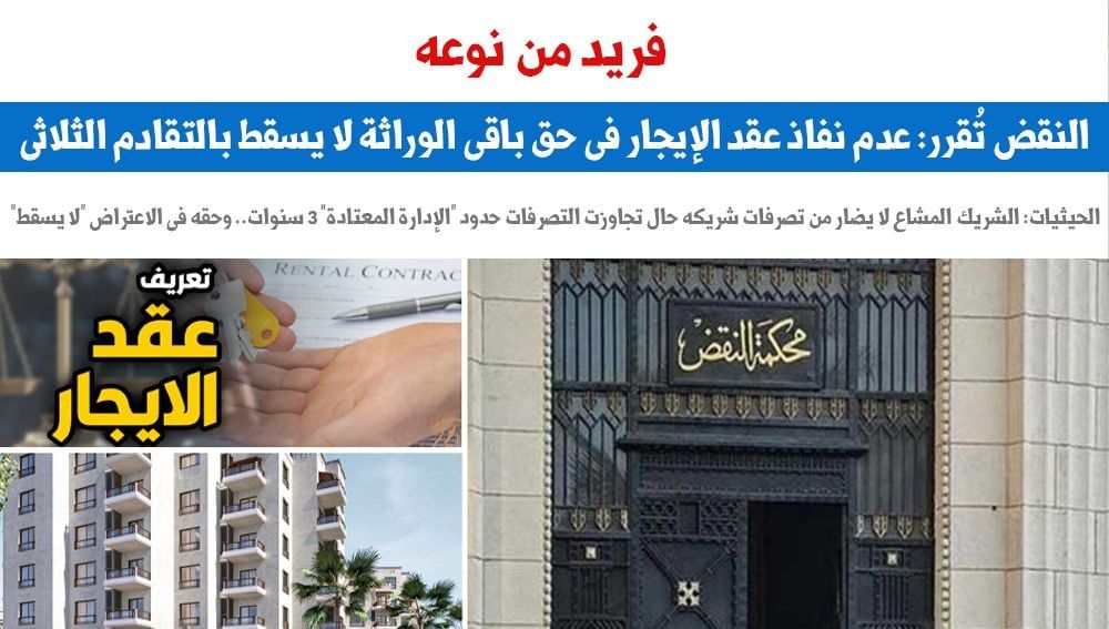 النقض تُقرر: عدم نفاذ عقد الايجار في حق باقي الوراثة لا يسقط بالتقادم الثلاثي.. والشريك المشاع لا يضار من تصرفات شريكه الآخر حال تجاوزت التصرفات حدود "الإدارة المعتادة" وهى 3 سنوات.. وحقه في الاعتراض "لا يسقط"