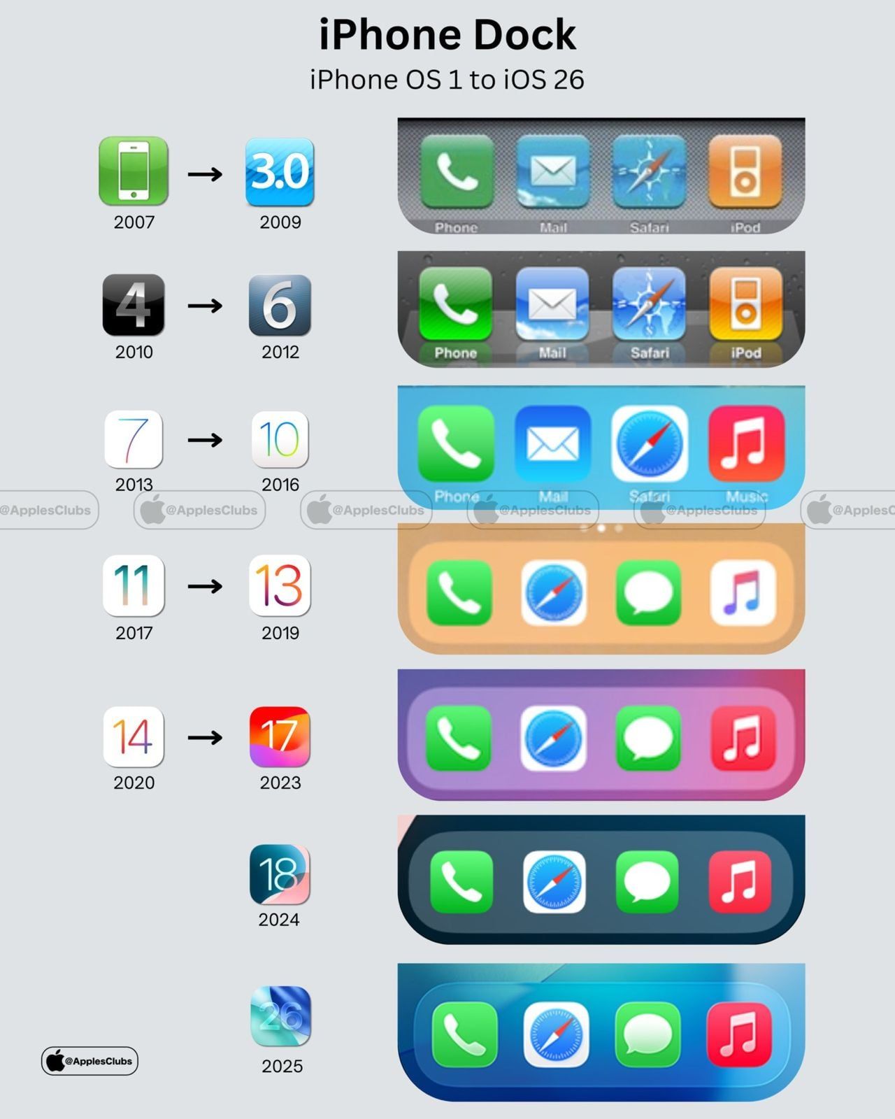 تحديثات تدريجية مع تطور iOS مع تطور نظام iOS، بدأت Apple في إدخال تحسينات تدريجية على شكل ووظيفة Dock، حيث ظهرت تغييرات واضحة في الألوان والتصميم، خاصة مع الانتقال من الأسلوب الكلاسيكي إلى التصميم المسطح (Flat Design) بداية من iOS 7.