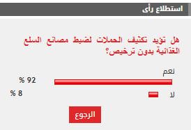 فى استطلاع للرأى طرحه "اليوم السابع" تحت عنوان هل تؤيد تكثيف الحملات لضبط مصانع السلع الغذائية بدون ترخيص؟، أيد غالبية القراء مطالب تكثيف الحملات لضبط مصانع السلع الغذائية بدون ترخيص.