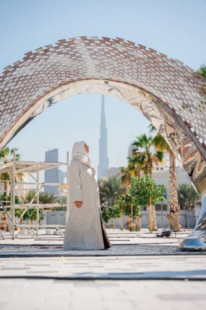 وأضافت: «شكل اختيار شاطئ جميرا موقعاً للعمل مصدر إلهام كبير؛ إذ يكتسب هذا العمل حضوره الحقيقي في هذا المكان تحديداً. فعند المرور تحته ومواجهة البحر، تتجلّى الطبيعة بكل جمالها، بينما تكشف الجهة الأخرى مشهد المدينة بأكملها، حيث تنعكس دبي، بأفقها العمراني وبرج خليفة، داخل العمل الفني، في تجربة بصرية تجمع بين الطبيعة والمدينة في إطار واحد».