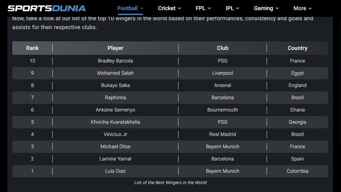 ويتصدر قائمة أفضل أجنحة العالم في 2026 لويس دياز نجم بايرن ميونخ، يليه لامين يامال نجم برشلونة، ثم مايكل أوليس وفينيسيوس جونيور، بفضل أدائهم الاستثنائي.
