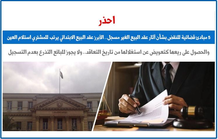 5 مبادئ قضائية للنقض بشأن آثار عقد البيع الغير مسجل.. الأبرز عقد البيع الابتدائي يرتب للمشتري استلام العين.. والحصول على ريعها كتعويض عن استغلالها من تاريخ التعاقد.. ولا يجوز للبائع التذرع بعدم التسجيل