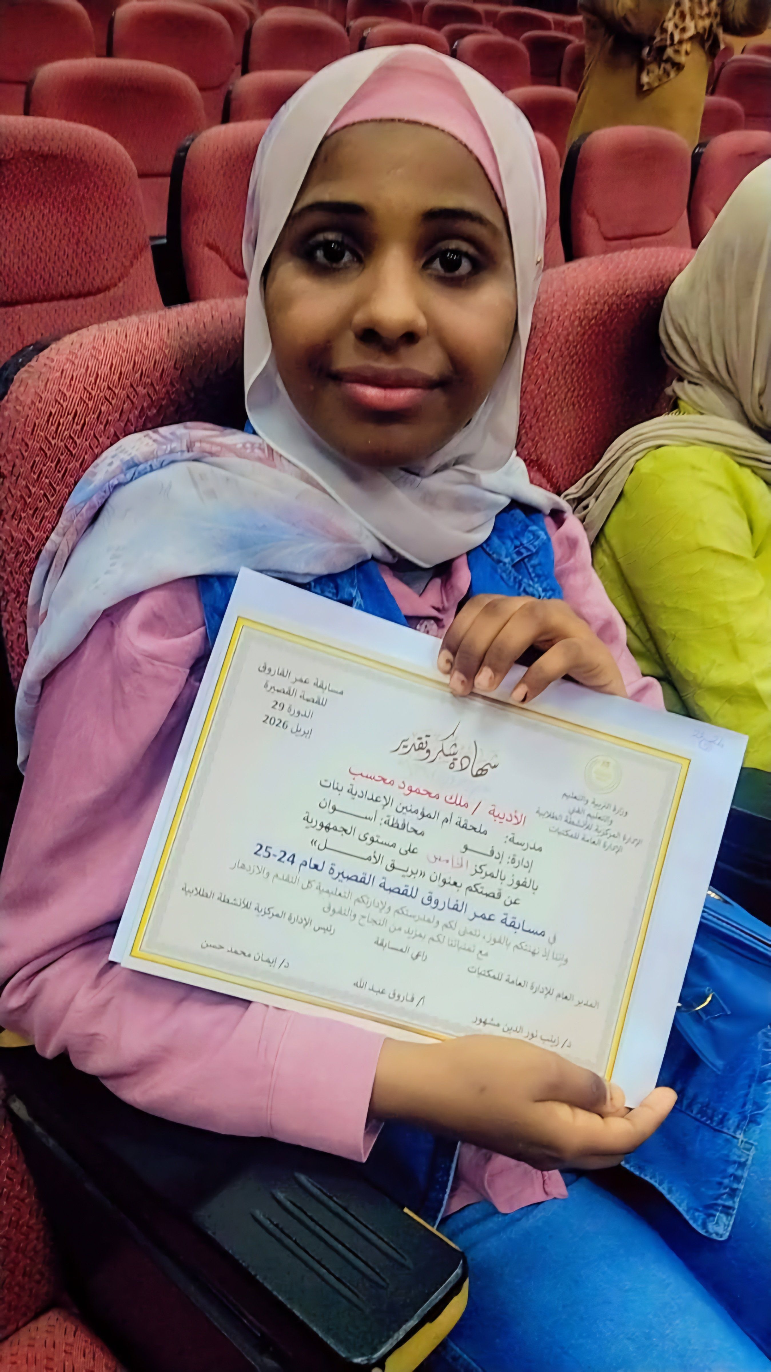 قدم الدكتور ربيع أبو يوسف، وكيل وزارة التربية والتعليم بأسوان، ومنال عبد الوهاب وكيل المديرية، التهنئة للطالبة "ملك محمود محسب" بمدرسة ملحقة أم المؤمنين الإعدادية بنات، التابعة لإدارة إدفو التعليمية، لفوزها بالمركز الخامس على مستوى الجمهورية عن قصتها المتميزة "بريق الأمل".