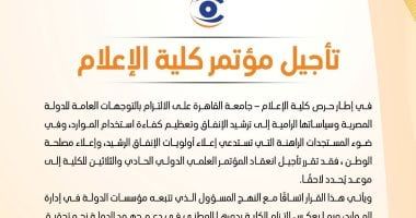 قررت كلية الإعلام بجامعة القاهرة، تأجيل انعقاد المؤتمر العلمي الدولي الحادي والثلاثين للكلية إلى موعد يُحدد لاحقًا، وذلك في إطار حرص كلية الإعلام – جامعة القاهرة على الالتزام بالتوجهات العامة للدولة المصرية وسياساتها الرامية إلى ترشيد الإنفاق وتعظيم كفاءة استخدام الموارد، وفي ضوء المستجدات الراهنة التي تستدعي إعلاء أولويات الإنفاق الرشيد، وإعلاء مصلحة الوطن.