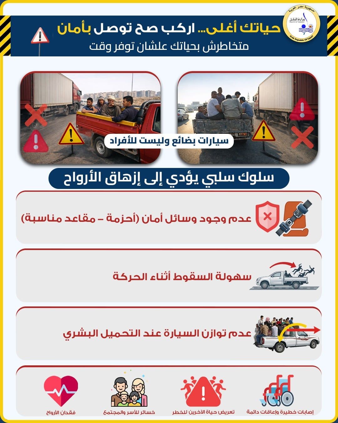 نشرت وزارة النقل، عبر صفحتها الرسمية على موقع التواصل الاجتماعي "فيسبوك"، إنفوجراف توعوياً يسلط الضوء على خطورة قيام بعض الأفراد بركوب عربات النقل المخصصة للبضائع وغير المجهزة لنقل الركاب. وأوضحت الوزارة أن هذا السلوك يعد من أخطر الظواهر التي تؤدي إلى وقوع حوادث مأساوية وإزهاق الأرواح.