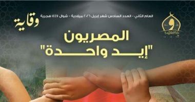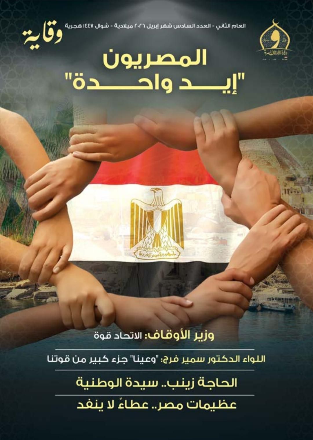 أصدرت وزارة الأوقاف العدد الجديد من مجلة "وقاية" لشهر أبريل، تحت عنوان: "المصريون إيد واحدة" للتأكيد على أهمية قوة الجبهة الداخلية في مواجهة التحديات خاصة في وقت الأزمات، وذلك في إطار رسالتها التوعوية والمجتمعية الرامية إلى تعزيز الوعي الثقافي والفكري، وترسيخ القيم الوطنية والإنسانية، وذلك تحت قيادة الأستاذ الدكتور أسامة الأزهري - وزير الأوقاف، وفي سياق جهود الوزارة المتواصلة للإسهام في بناء الإنسان وتنمية الوعي المجتمعي.