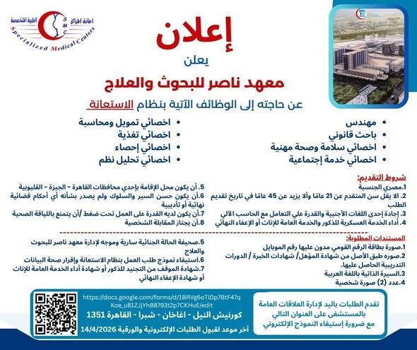 يعلن معهد ناصر للبحوث والعلاج عن حاجته إلى الوظائف الآتية بنظام الاستعانة: