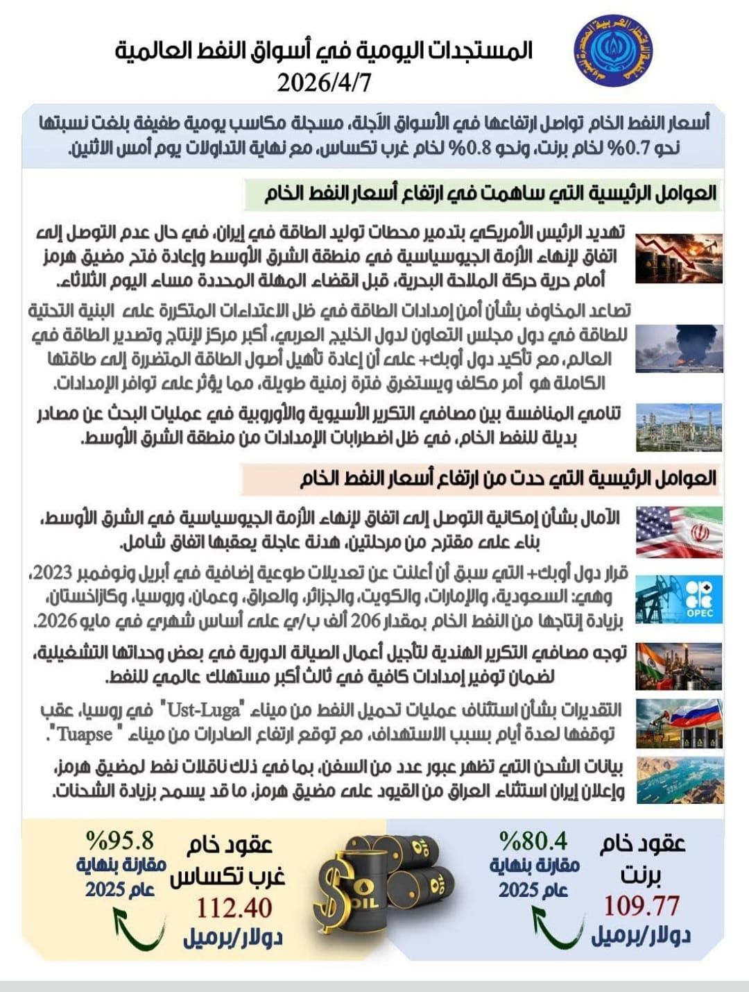 الثلاثاء، 07 أبريل 2026 02:35 مووفقا لتقرير لمنظمة أوابك تضمنت تلك العوامل ايضا تصاعد المخاوف بشأن أمن إمدادات الطاقة في ظل الاعتداءات المتكررة على البنية التحتية للطاقة في دول مجلس التعاون لدول الخليج العربي، أكبر مركز لإنتاج وتصدير الطاقة في العالم، مع تأكيد دول أوبك + على أن إعادة تأهيل أصول الطاقة المتضررة إلى طاقتها الكاملة هو أمر مكلف ويستغرق فترة زمنية طويلة، مما يؤثر على توافر الإمدادات.