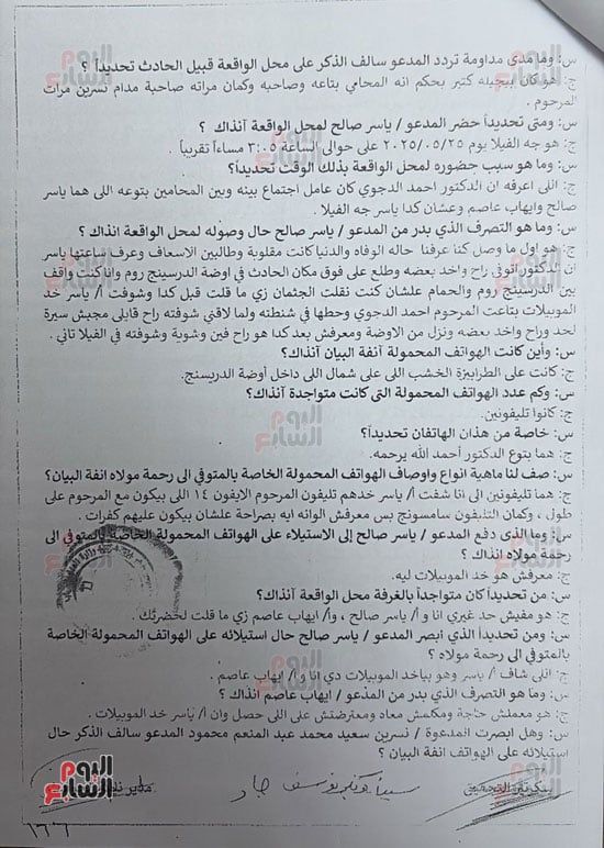 ج: هو أول ما وصل كنا عرفنا حاله الوفاة والدنيا كانت مقلوبة وطالبين الأسعاف وعرف ساعتها ياسر إن الدكتور اتوفى راح واخد بعضه وطلع على فوق مكان الحادث فى أوضة الدرسينج روم وانا كنت واقف بين الدرسينج روم والحمام علشان كنت نقلت الجثمان زي ما قولت قبل كدا، وشوفت أ/ ياسر خد الموبيلات بتاعت المرحوم أحمد الدجوى وحطها فى شنطته ولما لاقنى شوفته راح قايلى مجبش سيرة لحد وراح واخد بعضه ونزل من الاوضة ومعرفش بعد كدا راح فين وشوية وشوفته فى الفيلا تانى.