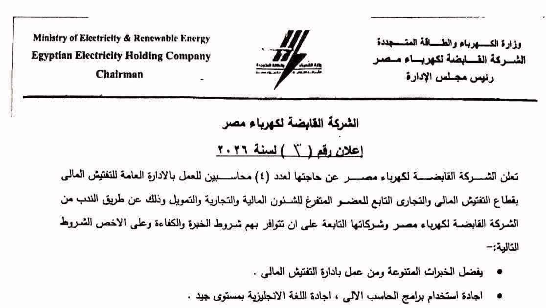 تعلن الشركة القابضة لكهرباء مصر عن حاجتها لعدد (٤) محاسبين للعمل بالإدارة العامة للتفتيش المالي بقطاع التفتيش المالي والتجاري التابع للعضو المتفرغ للشئون المالية والتجارية والتمويل وذلك عن طريق الندب من الشركة القابضة لكهرباء مصر وشركاتها التابعة على أن تتوافر بهم شروط الخبرة والكفاءة