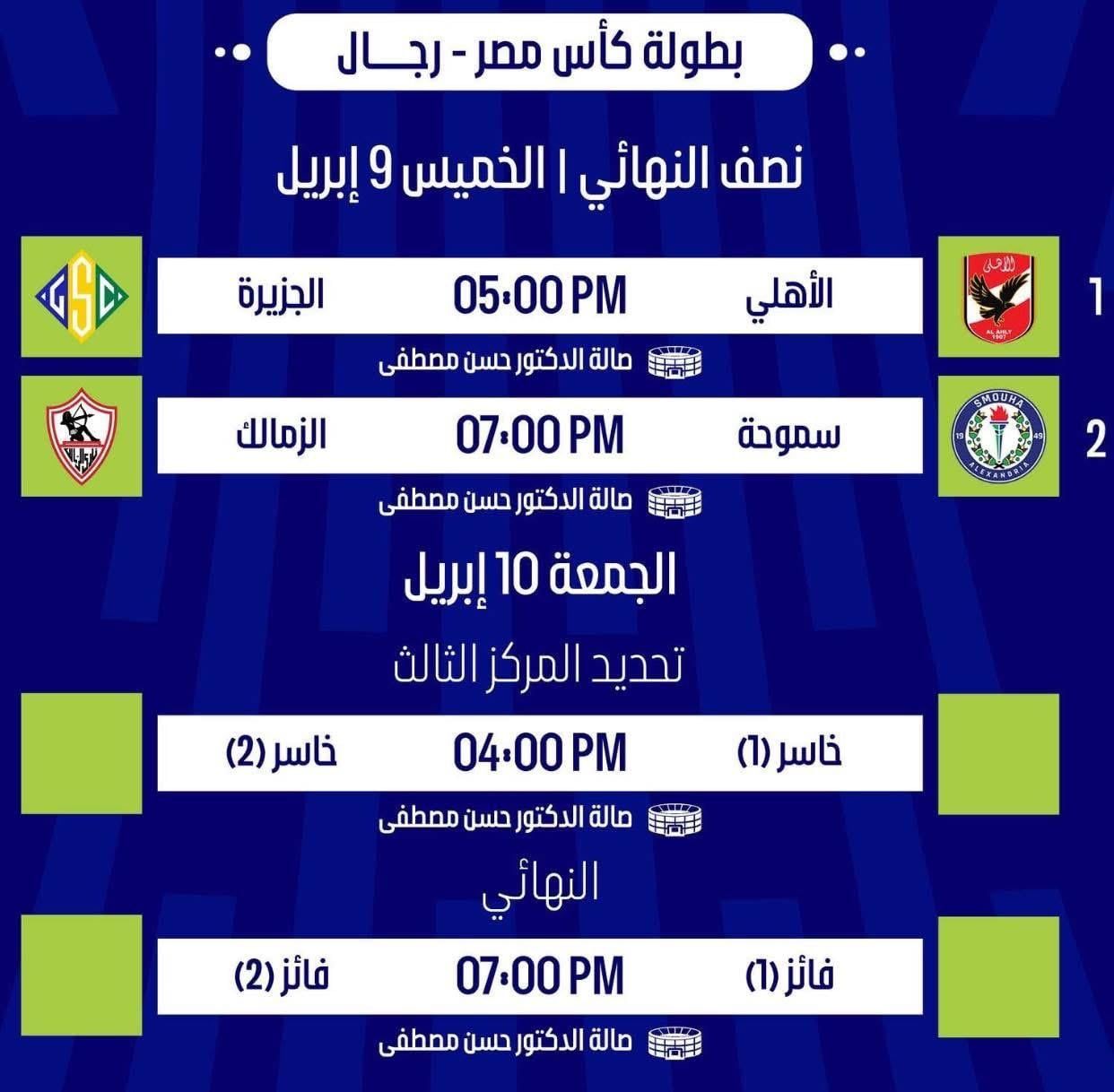 ويقام النهائي يوم الجمعة 10 إبريل في تمام الساعة 7:00 مساء بينما تُلعب مباراة تحديد المركز الثالث و الرابع الساعة 4:00 مساء في نفس اليوم.
