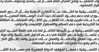 وجددت التنسيقية تأكيدها على أن السلام العادل والشامل يظل الخيار الوحيد القادر على إنهاء دوائر الصراع، وتحقيق تطلعات الشعوب نحو الأمن والازدهار، مشيدة بالدور المصري المتوازن الذي يضع الاستقرار الإقليمي في صدارة أولوياته.