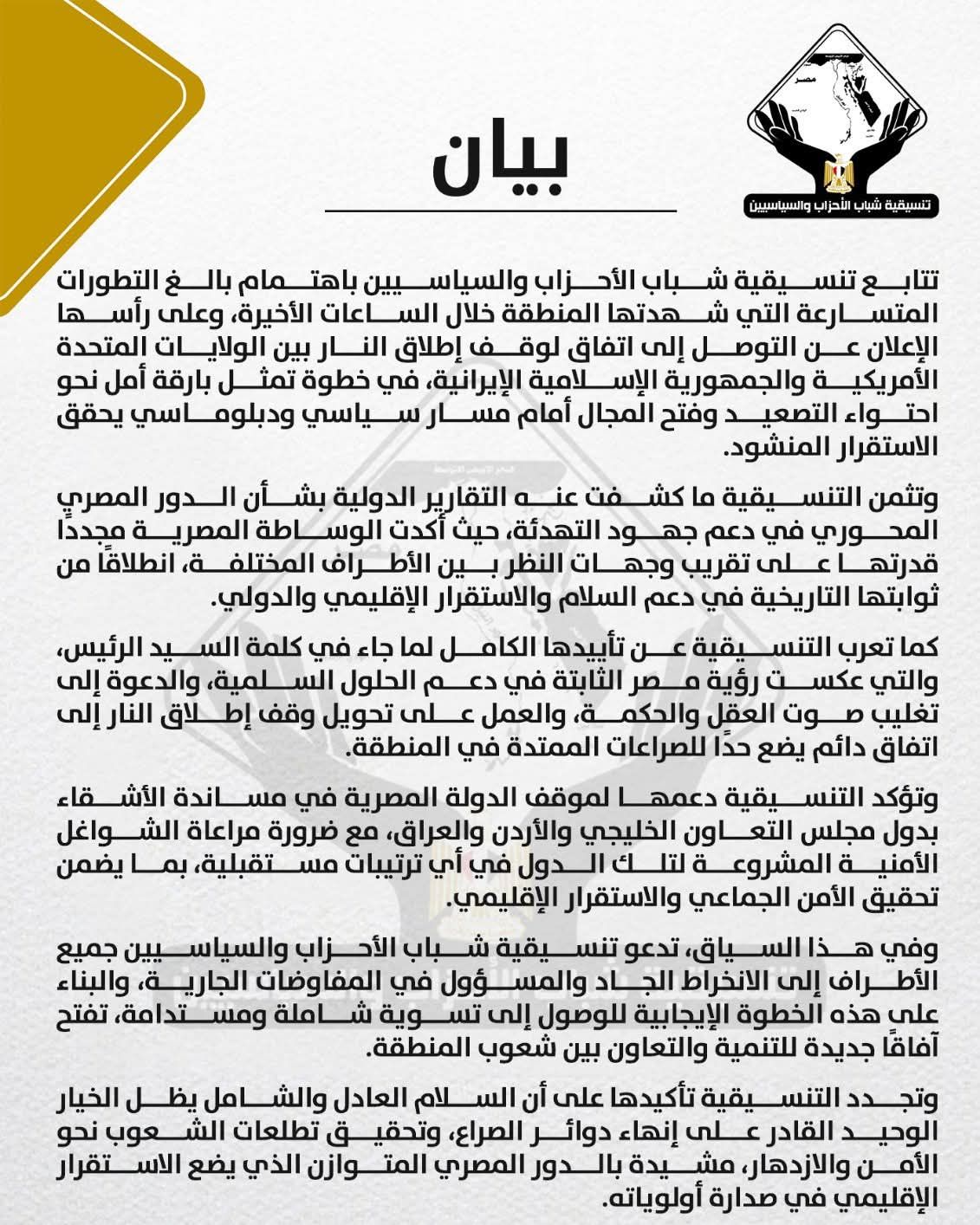 كما أعربت التنسيقية عن تأييدها الكامل لما جاء في كلمة السيد الرئيس، والتي عكست رؤية مصر الثابتة في دعم الحلول السلمية، والدعوة إلى تغليب صوت العقل والحكمة، والعمل على تحويل وقف إطلاق النار إلى اتفاق دائم يضع حدًا للصراعات الممتدة في المنطقة.