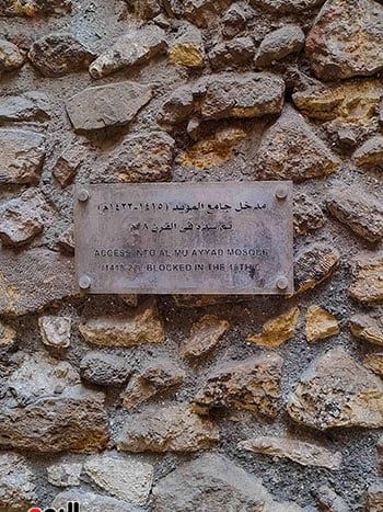 وعند الدخول من باب المسجد الرئيسي نجد على اليسار سبيل للمياه كان يستخدم قديما في إرواء ظمأ رواد المسجد وعابري السبيل، ويتكون جامع السلطان المؤيد من صحن في الوسط مفتوح ومحاط بأربعة أروقة، أكبرها وأعمقها هو رواق اتجاه قبلة الصلاة، وجدرانه مغطاة برخام ملون إلى مستوى المحراب.