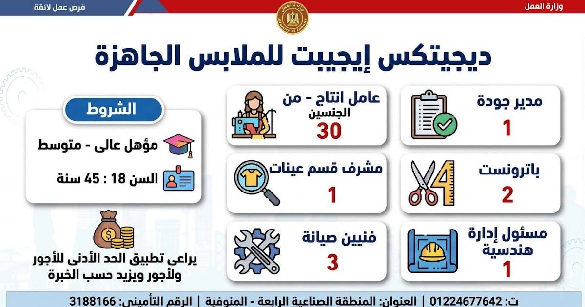 وبيّنت الوزارة في بيان لها أن النشرة تضم فرصًا متنوعة في عشرات التخصصات والمهن، برواتب مجزية تُحدد وفق طبيعة الوظيفة والمقابلة الشخصية، مع الالتزام الكامل بتطبيق الحد الأدنى للأجور، والاستفادة من مظلة التأمينات الاجتماعية والصحية، بما يضمن بيئة عمل آمنة ومستقرة تحفظ كرامة العامل وتصون حقوقه..كما تشمل النشرة فرصًا مخصصة لذوي الهمم في إطار سياسة دمجهم في سوق العمل...وتغطي الفرص الجديدة محافظات: القاهرة، الإسكندرية، الشرقية، دمياط، الغربية، المنيا، بني سويف، شمال سيناء، الأقصر، أسوان، القليوبية، والمنوفية، في تخصصات متعددة تشمل:التسويق والموارد البشرية، الهندسة (اتصالات وكهرباء)، الميكانيكا والتحكم الكهربائي، الصيانة، المحاسبة، الإشراف الفني والموقعي، الإنتاج، المشتريات، المبيعات، الجودة، الأمن، المخازن، القيادة برخص مختلفة، الفندقة والمطاعم، إلى جانب أعمال الإنتاج والنظافة وتخصصات أخرى متنوعة.