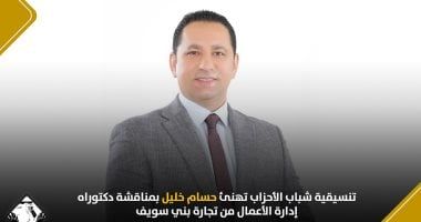 تقدمت تنسيقية شباب الأحزاب والسياسيين بخالص التهنئة للنائب حسام خليل، عضو مجلس النواب وعضو التنسيقية، بمناسبة مناقشته رسالة الدكتوراة المهنية واستيفائه متطلبات الحصول على درجة دكتوراة إدارة الأعمال من كلية التجارة بجامعة بني سويف.