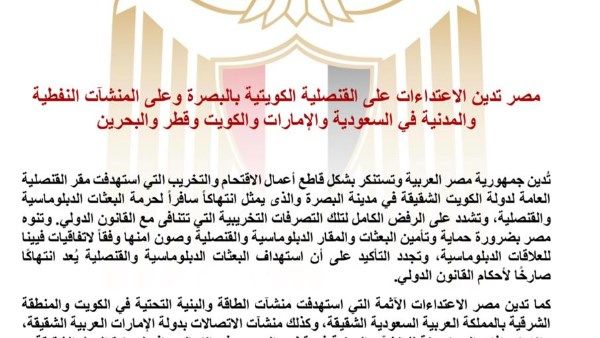 أعربت جمهورية مصر العربية عن إدانتها واستنكارها الشديد للأعمال التخريبية التي استهدفت القنصلية العامة لدولة الكويت في البصرة، معتبرة ذلك انتهاكاً صارخاً للقانون الدولي ولاتفاقيات فيينا للعلاقات الدبلوماسية التي تضمن حماية وتأمين البعثات الدبلوماسية والقنصلية.
