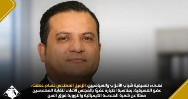 الأربعاء، 08 أبريل 2026 07:32 مهنأت تنسيقية شباب الأحزاب والسياسيين، الزميل المهندس حسام عطفت، عضو التنسيقية، بمناسبة اختياره عضوًا بالمجلس الأعلى لنقابة المهندسين، ممثلًا عن شعبة الهندسة الكيميائية والنووية فوق السن.