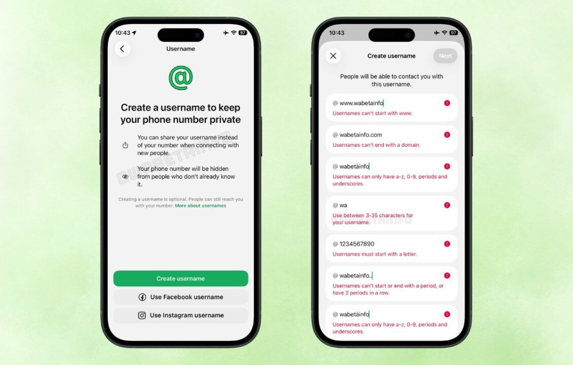 وتفرض واتساب مجموعة من الضوابط على أسماء المستخدمين، أبرزها احتواء الاسم على حرف واحد على الأقل، واستخدام أحرف إنجليزية صغيرة أو أرقام أو نقاط أو شرطات سفلية فقط، وألا يبدأ الاسم بـ”www” أو ينتهي بنطاقات مثل “.com”، وألا يبدأ أو ينتهي بنقطة، وأن يتراوح الطول بين 3 و 30 حرفًا.