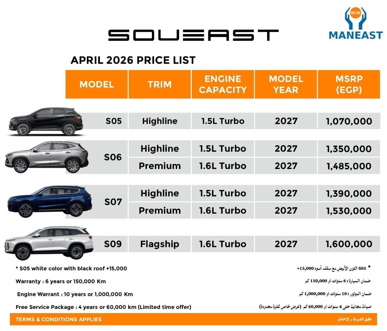 ثانيا: أسعار سوإيست S06 الجديدةسعر S06 هاي لاين الجديد سجل 1.350.000 جنيه بدلًا من 1.290.000 جنيه بزيادة 60000 ألف جنيه للمرة الثانية خلال أبريل حيث كانت الزيادة الاولي خلال مارس حوالي 41000 جنيه مصري و كان السعر 1.249.000 جنيه .