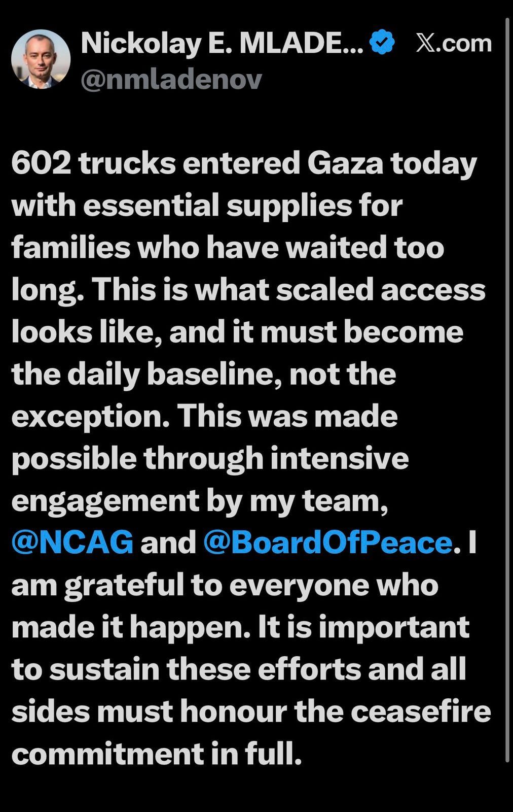 وكتب ملادينوف على حسابه على منصة اكس: لقد تحقق ذلك بفضل الجهود المكثفة التي بذلها فريقي، وفريق اللجنة الوطنية لإدارة غزة، ومجلس السلام، أنا ممتن لكل من ساهم في إنجاح ذلك، من المهم استمرار هذه الجهود، وعلى جميع الأطراف الالتزام الكامل بتعهدات وقف إطلاق النار.